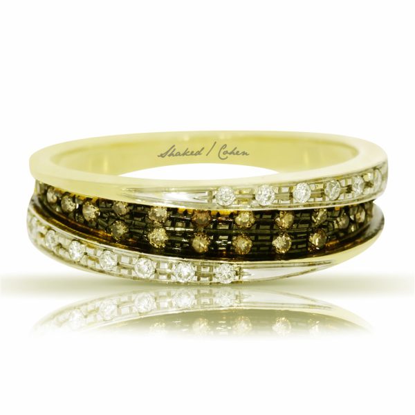 טבעת זהב מעוצבת בשני גבהים. משובצת יהלומים חומים ולבנים במשקל כולל של 0.36 קראט. ניתן לשלב עם יהלומים שחורים במקום יהלומים שחורים למראה מודגש ויוקרתי